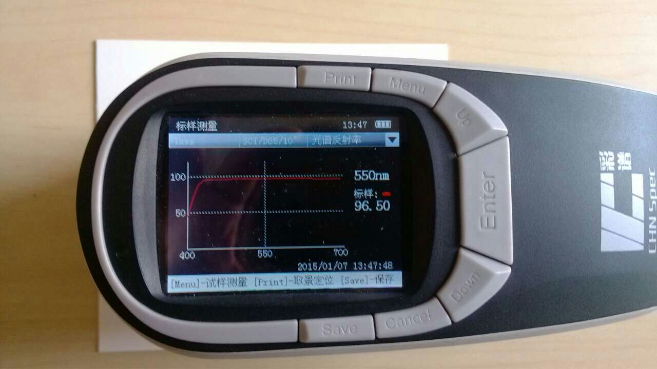 通過(guò)up 和down鍵可以移動(dòng)光標(biāo),顯示各個(gè)波長(zhǎng)下的反射率,如圖中顯示550nm,反射率為96.50