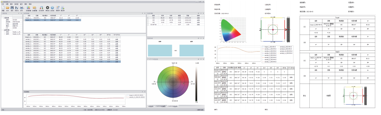 在“顏色檢測(cè)”功能模塊,用戶可通過電腦軟件校準(zhǔn)、測(cè)量、設(shè)置分光測(cè)色儀。 用戶可將云端數(shù)據(jù)庫(kù)中的顏色作為標(biāo)樣測(cè)色差,查看光譜圖、色差圖、標(biāo)樣試樣數(shù)據(jù),以及導(dǎo)出想要的數(shù)據(jù)測(cè)試報(bào)告。